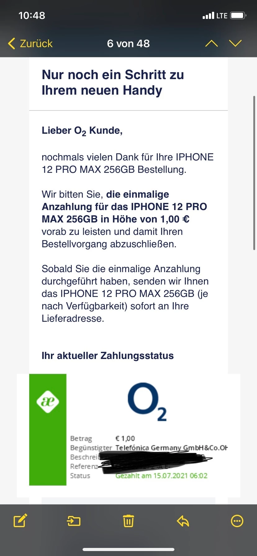 ich habe am 15.07.2021 ein alternativ Angebot erhalten, welches ich annahm und eine Anzahlung getätigt habe, für meine o2 my Handy Bestellung.