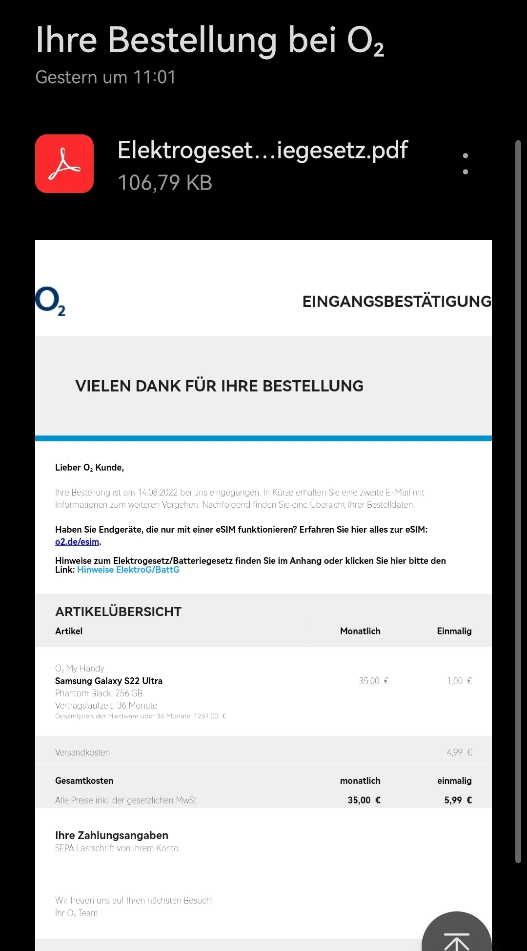 Bestellung Samsung s22 ultra Eingangsbestätigung