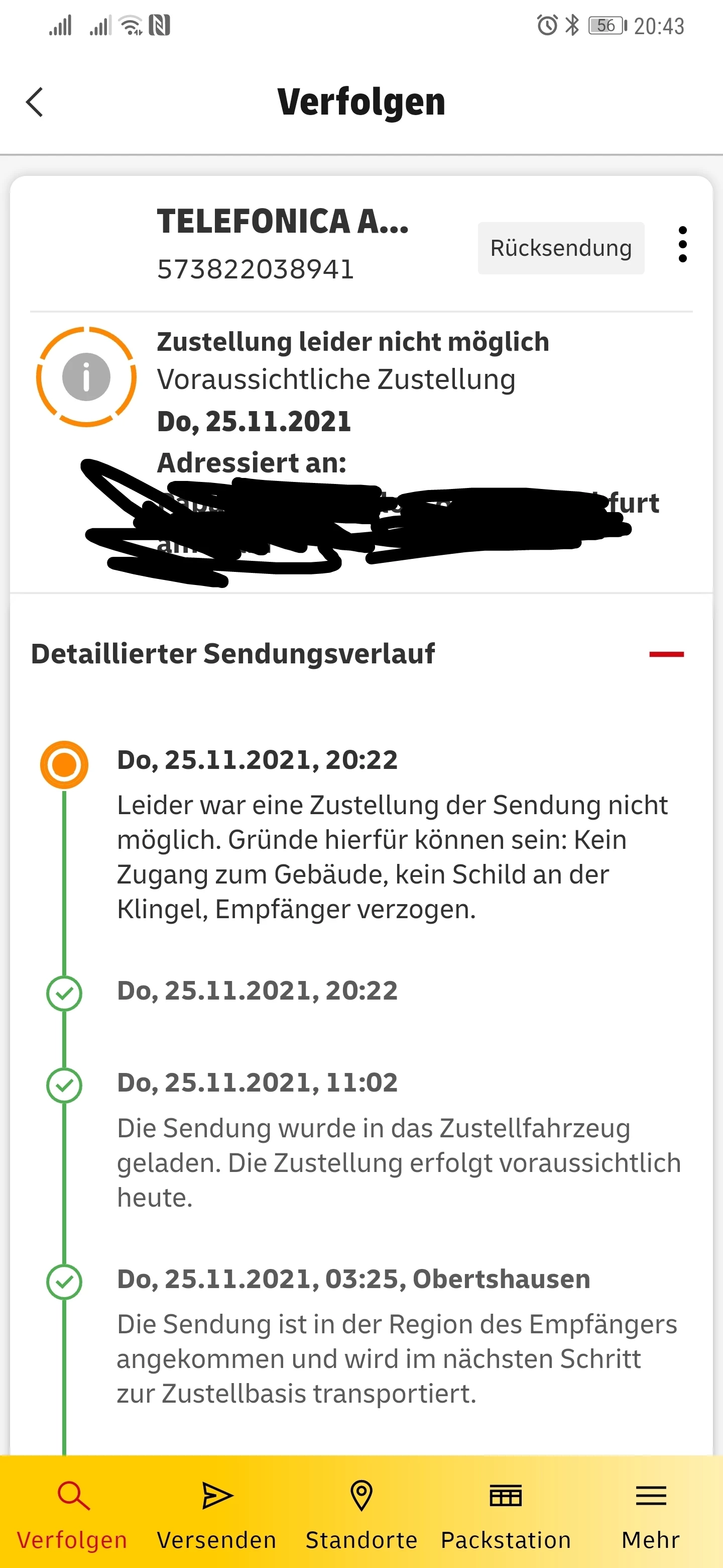 Der DHL hat wohl seine Schicht nicht geschafft. Um 20:22 hat er angeben, dass das Paket nicht zustellbar ist. Ich habe dem Status 4 min. später gesehen (20:26). Ich bin sofort rausgerannt und um den Block gelaufen. Kein DHL Bote! Die Adresse stimmt! Die neue SIM ist ja auch gekommen.
