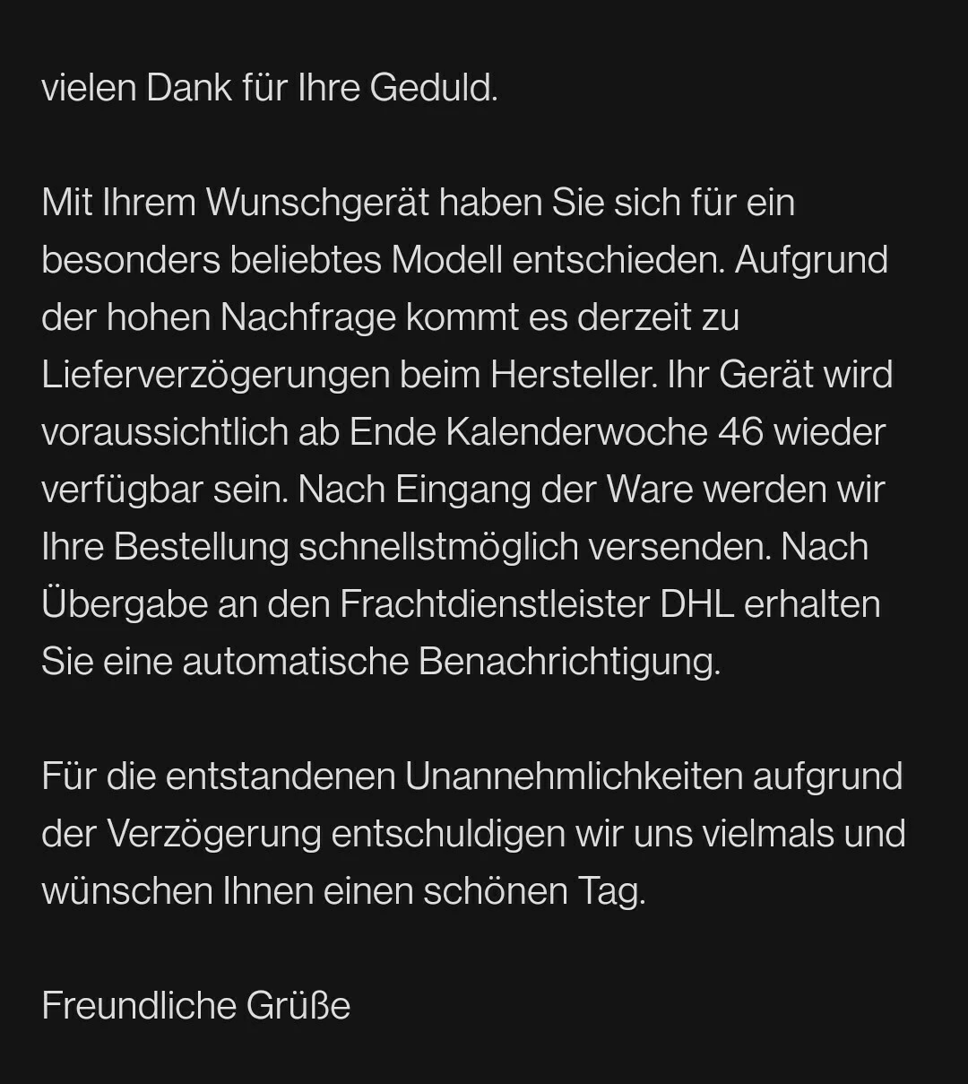 Solche Nachrichten beheben freilich nicht, dass das Produkt noch immer nicht versandt ist, stillen aber elementar das berechtigte Bedürfnis nach Information und Information wäre das einfache Mittel gewesen, um Unmut über Chaos, Unwissenheit und falsche Informationen vorzubeugen. Wie gesagt, der Grund für den Unmut ist vor allem einfach das Fehlen von schlüssiger, einheitlicher Kommunikation. Nicht mehr, nicht weniger. Dass in Zeiten der Rohstoffknappheit Geräte und Produkte schwerer zu beschaffen und vor allem herzustellen sind, ist nicht nur logisch, sondern verständlich und ich denke allen hier bereits längst schlüssig. Lieferprobleme sind nicht das Problem, es ist die fehlende Information darüber und das Vakuum, in dem man gehalten wird, wenn nach der Bestellung einfach gar nichts mehr zu hören ist von offizieller Seite.