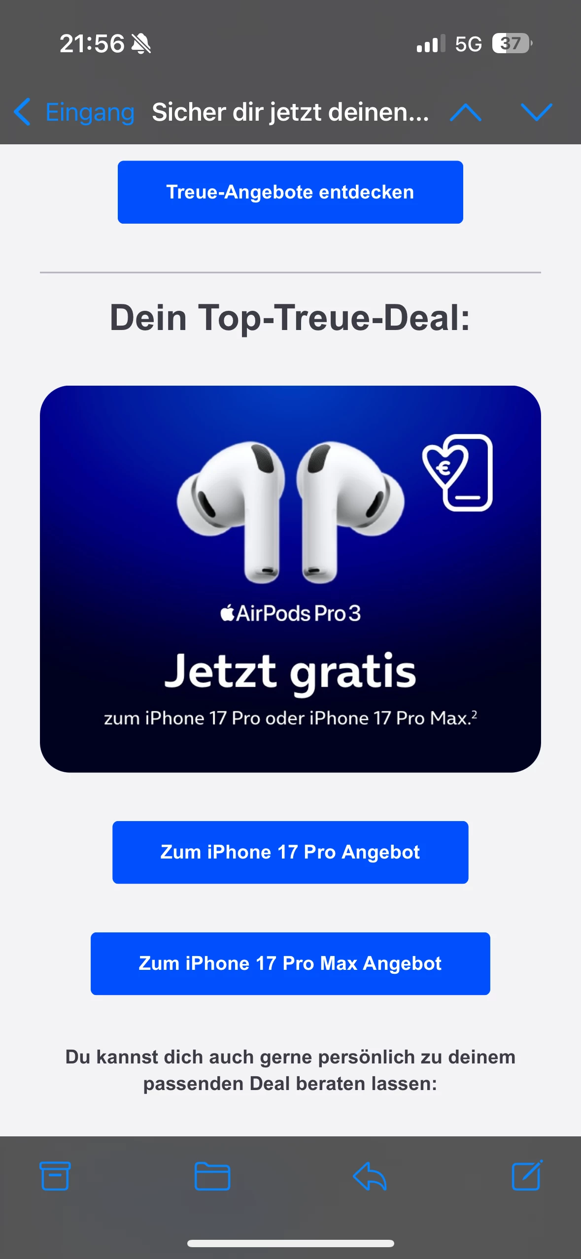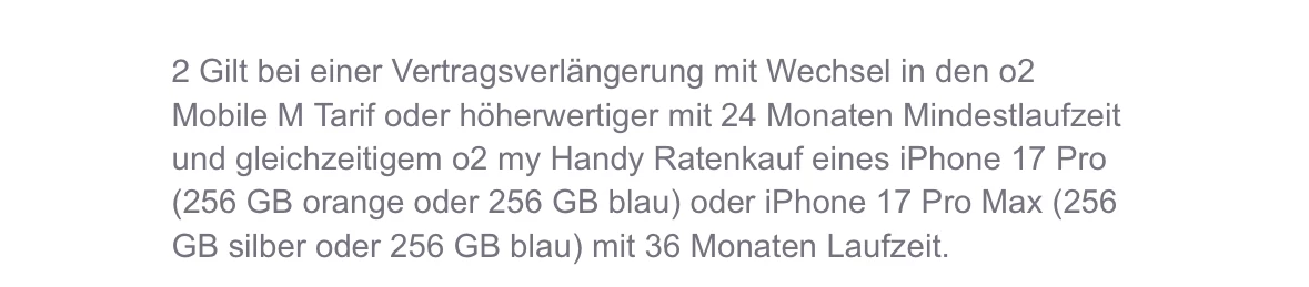 Liebes O2 Team, ich möchte momentan gerne meine Verträge verlängern und außerdem bei einem Vertrag das neue iPhone Pro dazu buchen. Euer Angebot welches ich per Email bekommen habe in der ihr mit „gratis AirPods Pro“ zum Vertrag und iPhone 17 pro werbt, fand ich direkt super.