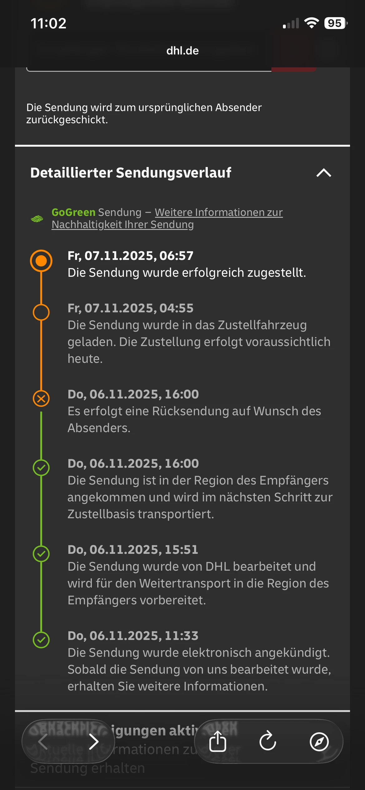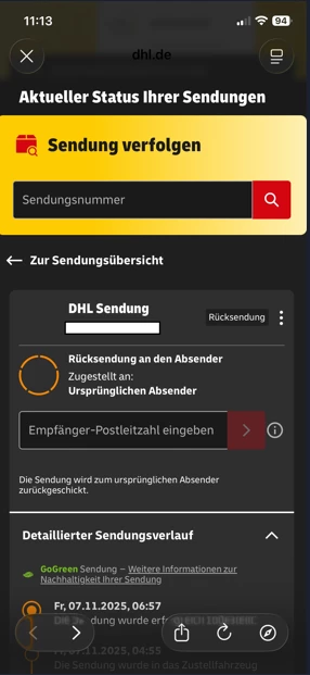 DHL-Sendung mit der Sendungsnummer xxxxxx laut Sendungsverfolgung an den Absender zurückgeschickt wurde.