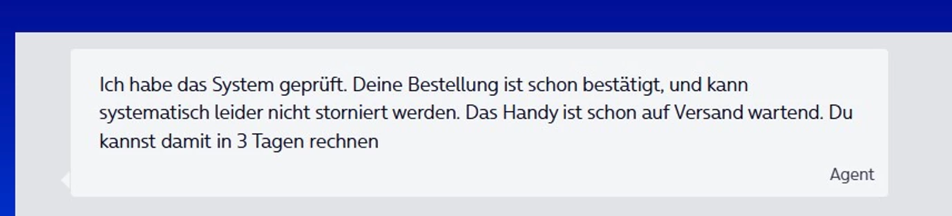 Was die Kolleg:innen in unserem Live Chat meinten ist, dass sie deine Bestellung nicht mehr im System auf Knopfdruck stornieren können, wie es bei einer ganz neuen Bestellung noch möglich ist.