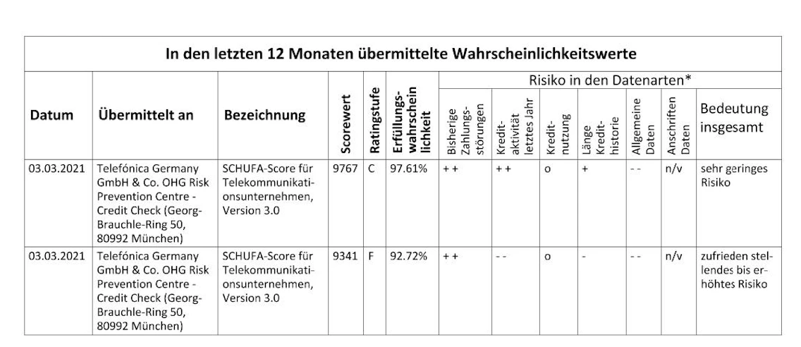Am 3.3.2021 hat Telefónica Germany .. unter der Nummer ... eine Anfrage zr Bonitätsprüfung vor Abschluss eines Telekommunikations-Vertrages gestellt.