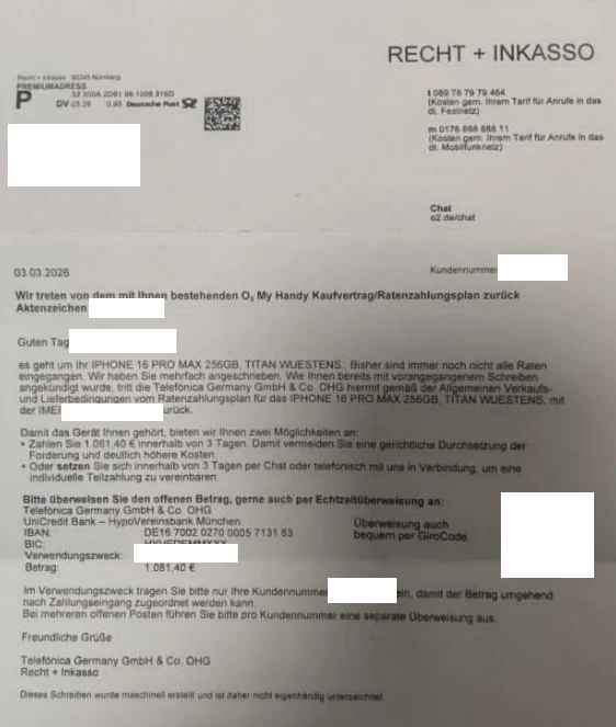o2 hat den Ratenplan aufgelöst und möchte die Restsumme jetzt in einem Stück haben.