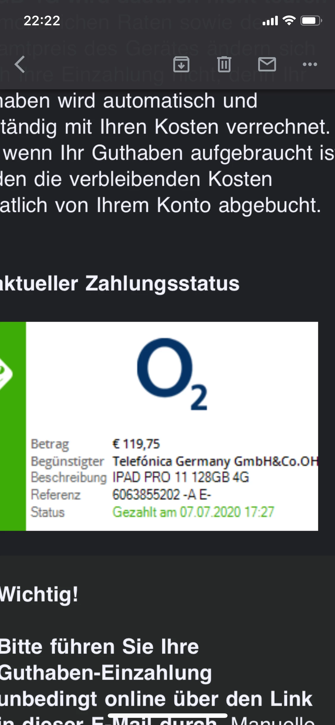 Hallo, ich habe am 5.07 ein IPad Pro 11 und ein IPhone 11 Pro Max bestellt. Am 07.07 habe ich den Betrag für die beiden Artikel angezahlt und bis heute weder eine Auftragsbestätigung oder meine Artikel erhalten..
