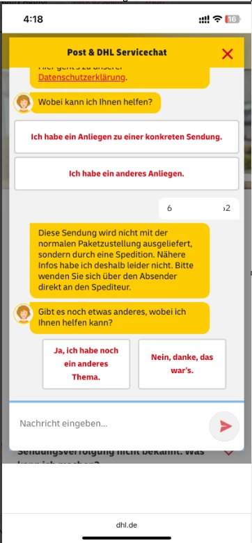 das hat mir der DHL-Support geschrieben. Können Sie mir bitte sagen, wo ich die Telefonnummer des Spediteurs bekommen kann, von dem sie sprechen?
