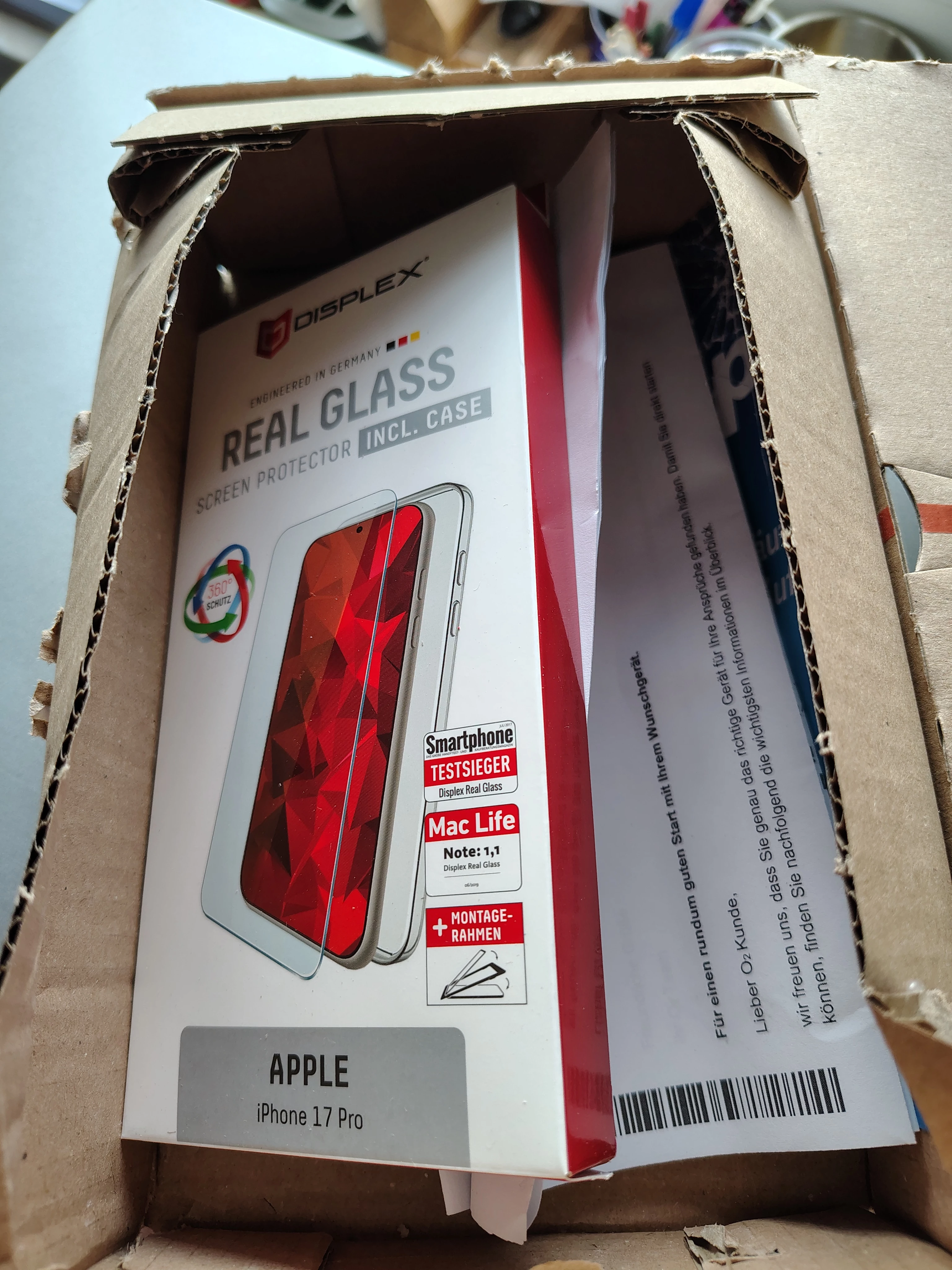 Wie sie auf den Fotos sehen, war das Paket beschädigt und nur die Unterlagen und das Handy Glaß waren