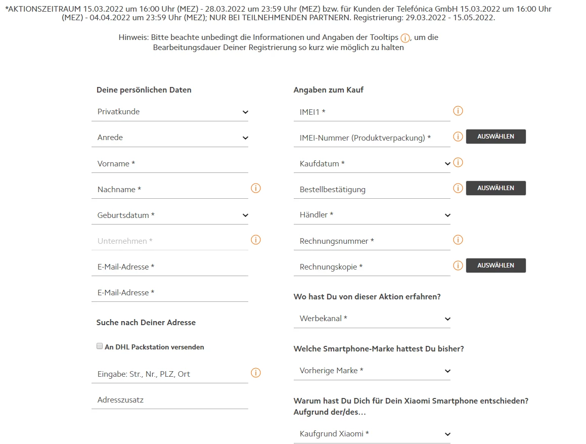 danke für deine Antwort über die PN. 😊 Ich gebe gerne die Daten weiter. Vorab habe ich noch die Bitte an dich, dass du einmal auf die Frage von o2_Jessica antwortest. Sie wollte wissen, ob du auf die Aktionsseite gegangen bist um dich zu registrieren? Ich wundere mich nämlich auch, dass du in deinem Post von einem Logistik Center schreibst. Wenn du es über die Aktionsseite von Xiaomi versucht hattest, wann kam dort die Fehlermeldung?