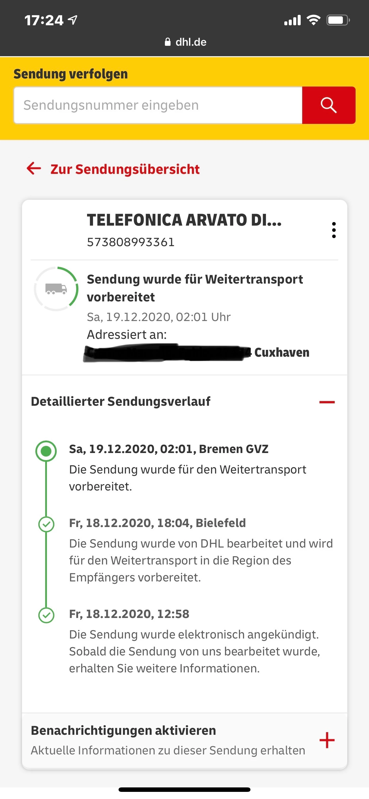 Hallo, habe meinen Vertrag verlängert und dazu mir das iPhone 12 pro Max bestellt. O2 hat das iPhone auch am 18.12.2020 per DHL versendet, dieser ist bis zur DHL Station in Bremen angekommen und seit dem 19.12.2020 bewegt sich überhaupt nichts mehr.