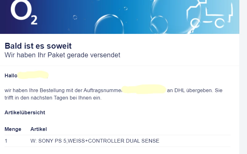Habe ebenso Auftragsbestätigung vom 18.05. PS5 Bundle mit Controller und habe soeben meine Versandbenachrichtigung von O2 bekommen, werde die Konsole dann am Samstag (Wunschtag) haben. :)