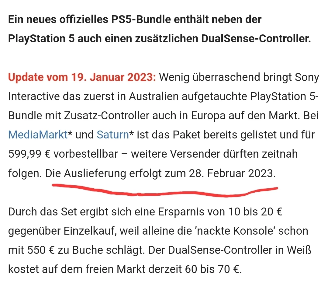 Ich habe im Internet gelesen das die Bundle Version "PS5 mit Laufwerk + zweitem Controller" erst ab dem 28.02.2023 generell zu haben ist. Was an dieser Aussage wahr ist, kann ich leider nicht sagen.
