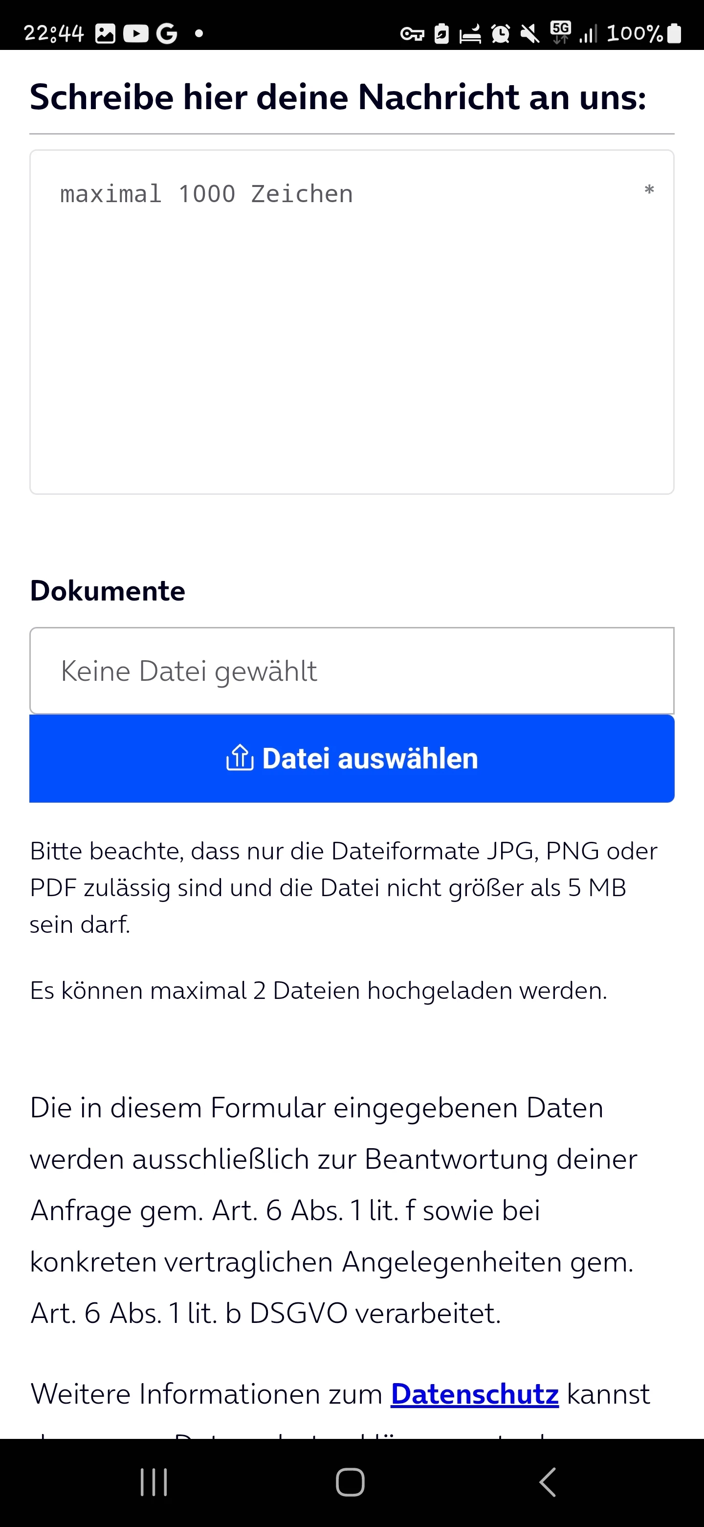 Und jetzt kannst du dein Anliegen schildern und zusätzlich noch Dokumente hochladen.