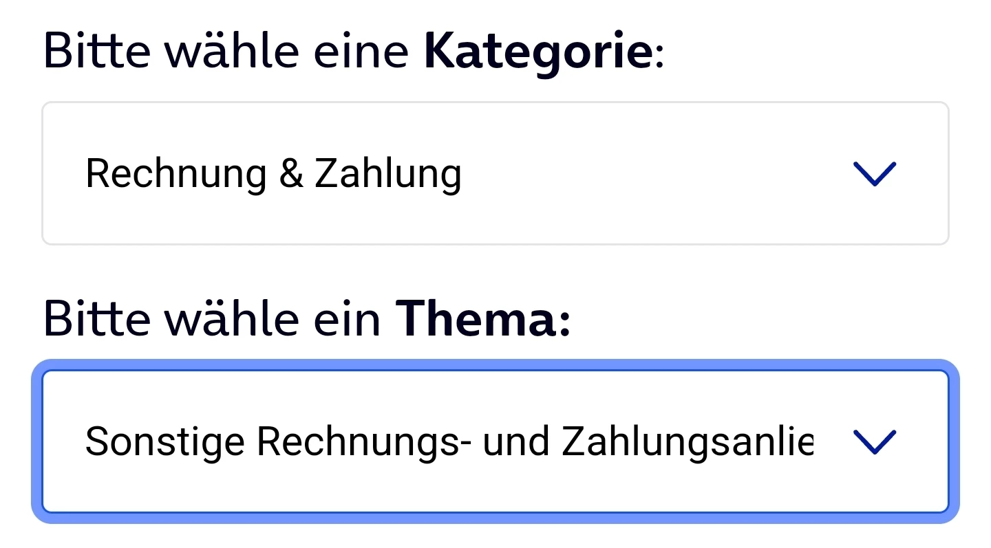 Eigentlich ist das ganz einfach du wählst die Kategorie Rechnung & Zahlung und als Thema Sonstige Rechnungs-Zahlungsanliegen aus