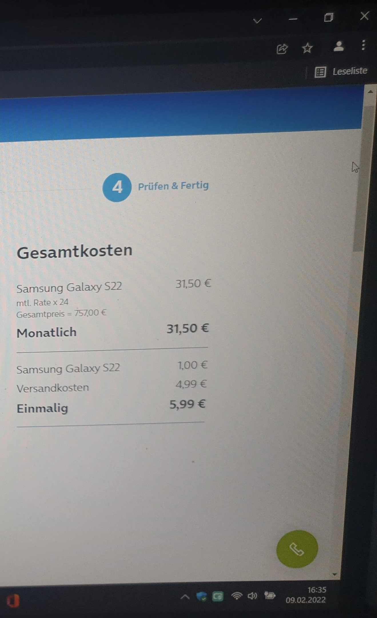 Habe gestern das S22 bestellt am 09.02.2022 um 16.35 Ortszeit anfangs war nur die 256GB Version verfügbar in Weiß über My Handy für 31,50 Euro Monatlich auf 24 Monate und einmalig 5,99 Euro mit ein Gesamtpreis für 757,00 Euro Lieferzeit war der 11.03.2022 daraufhin habe ich keine Email Bestätigung erhalten. Um 16.50 konnte man das Produkt dann nicht mehr Online bestellen weil es Rot Markiert war, stand zur Zeit nicht Lieferbar. Dann um 17 Uhr war die 128GB Version auch erhältlich und die 256gb Version nochmal aber für 37,50 Euro Monatlich und einmalig 5,99 Euro auf 24 Monate, Gesamtpreis dann 901,00 Euro!!  Habe dann die Hotline angerufen die haben mir versucht etwas anderes an zu drehen. Daraufhin ne Email geschrieben ohne Rückmeldung. Jetzt auf Facebook kam eine Nachricht mit der Rückmeldung, das eine Bestellung auf meinen Kundendaten nicht ersichtlich ist. Das ist doch ein schlechter Witz!. Das ist ein Fehler seitens O2 Deutschland nicht von Mir.