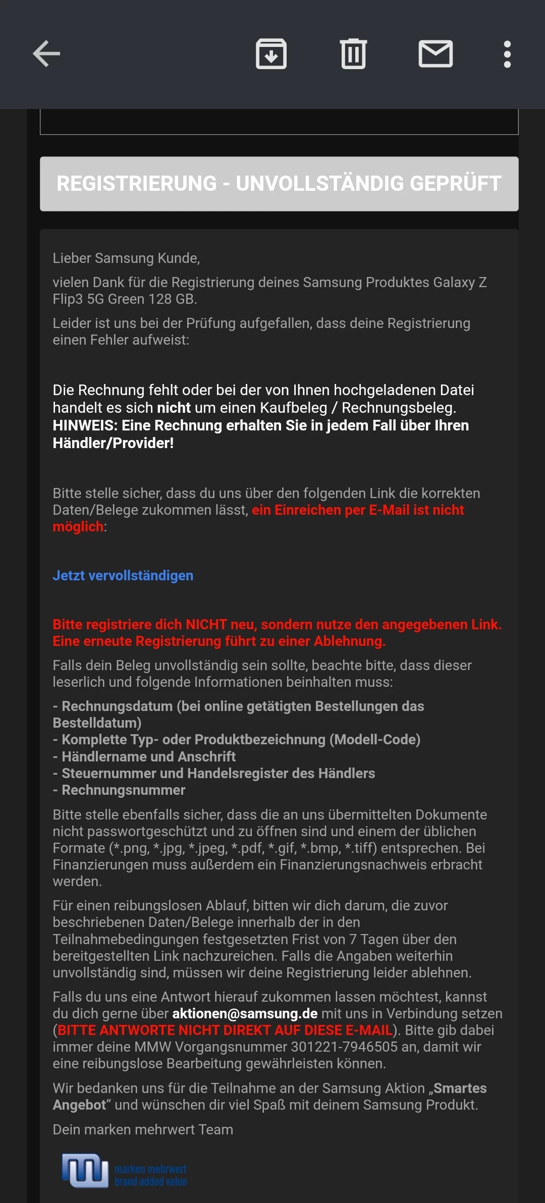 Bei meiner sehr, sehr umständlichen Registrierung bei Samsung erhielt ich die Mitteilung,  das ich nicht die richtige Rechnung beigelegt habe. Ich habe bereits um eine Rechnung gebeten. Aber auch auf dem Postweg immer noch nichts erhalten. Meine Registrierung endet in wenigen Tagen. Wie bekomme ich jetzt meine Uhr???