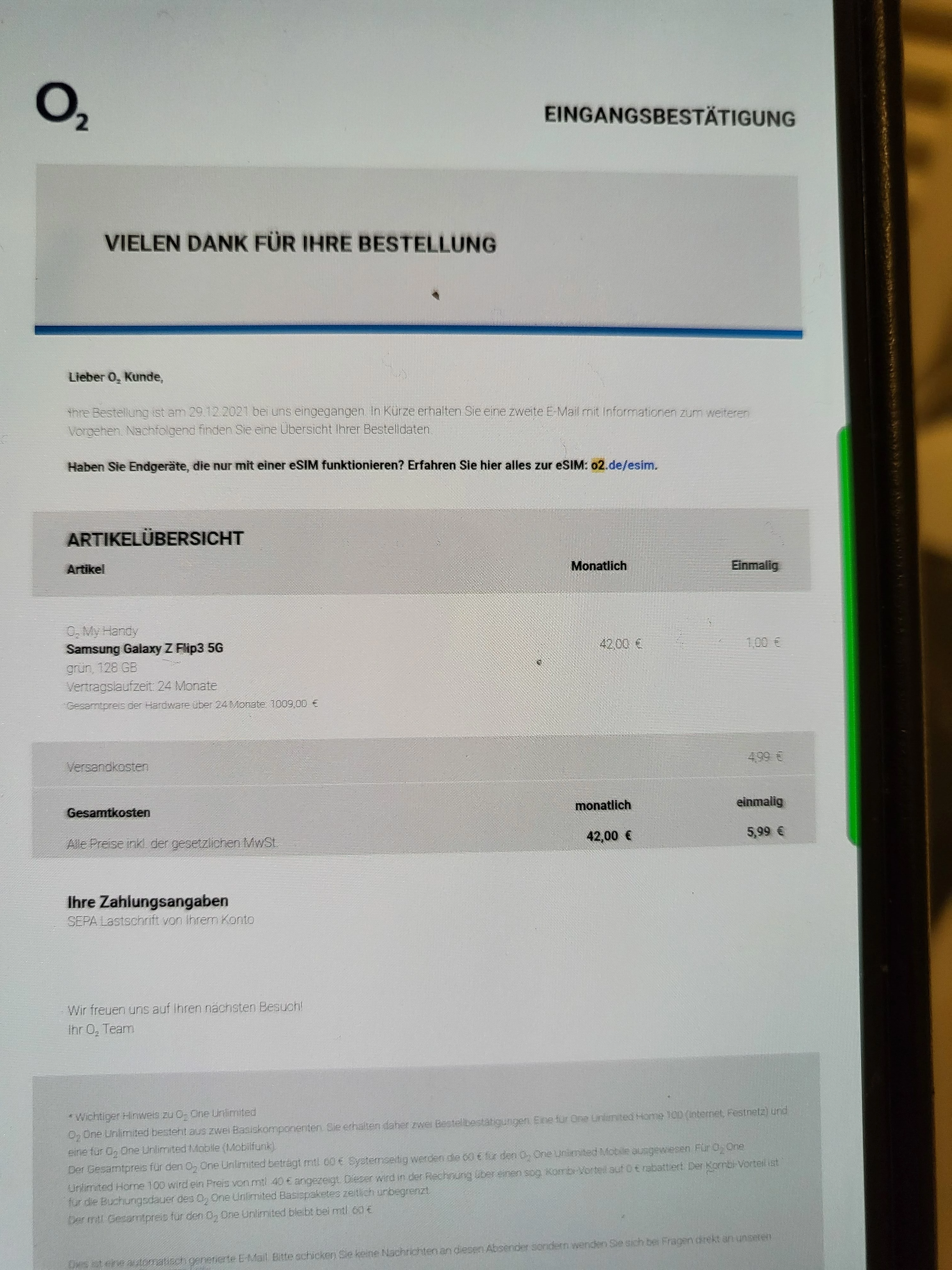 Hallo, ich habe ein Samsung Galaxy Z flip3 inklusive der Samsung Watch 4 für monatliche 42,- Euro.