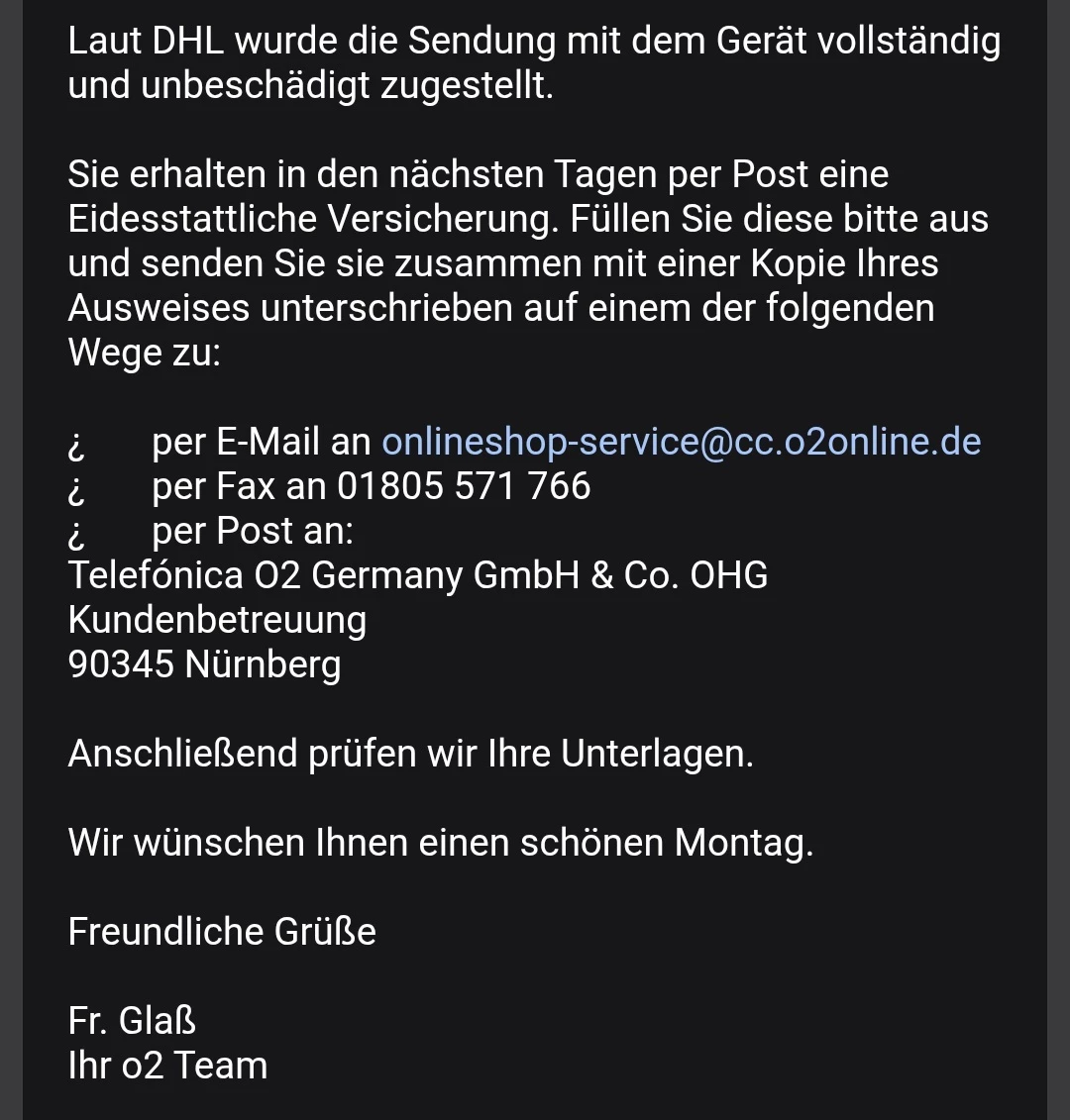 @C_Cold danke dir für deine Rückmeldung. 🙂 Die E-Mail, die du dazu erhalten hast, ist tatsächlich von uns und somit seriös. Da brauchst du dir also keine Sorgen machen. Eine eidesstattliche Versicherung ist allerdings kein Muss. Du kannst selbst entscheiden, ob du diesen Weg gehen möchtest. Alternativ, wie hier auch schon erwähnt wurde, reicht oft auch eine einfache schriftliche Erklärung von dir aus. Das kann den Prozess etwas beschleunigen und die Bearbeitung für die Fachabteilung erleichtern. 😌