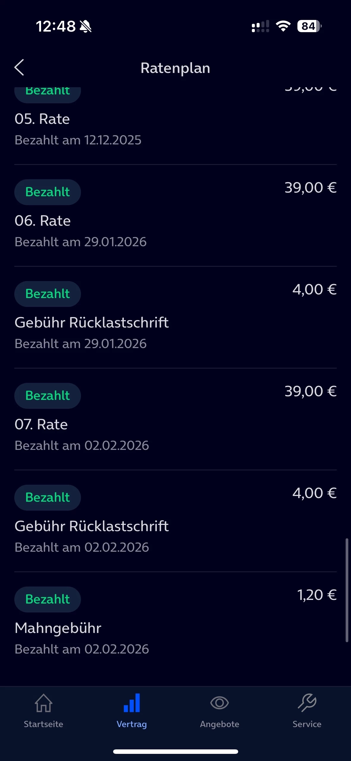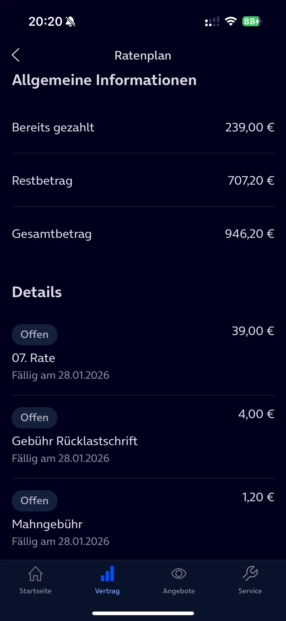 Ich habe ein Handy auf Raten gekauft und zahle monatlich 39 Euro. Heute wurde mir ein Betrag von 87,20 Euro abgebucht. Ich habe meine Kundennummer überprüft, und die Abbuchung bezieht sich tatsächlich auf das Handy. Warum hat sich der Betrag ohne Vorwarnung erhöht? Ich habe keine offenen Zahlungen.
