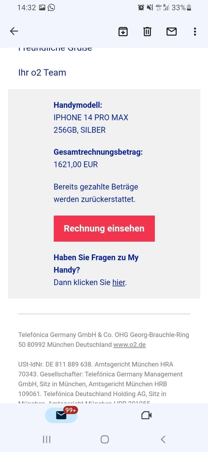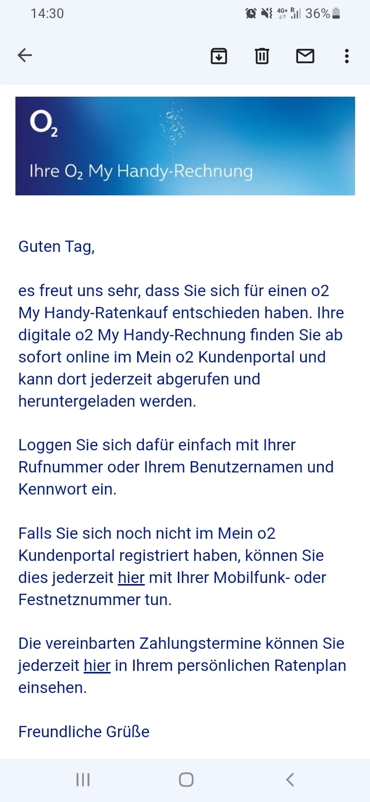 Wenn du die Anzahlung leistest und O² deine Bestellung genehmigt, sprich annimmt, erhältst du eine weitere Email als Auftragsbestätigung. Wenn das kommt, kannst du sicher sein, dass du dein Gerät geliefert bekommen wirst.
