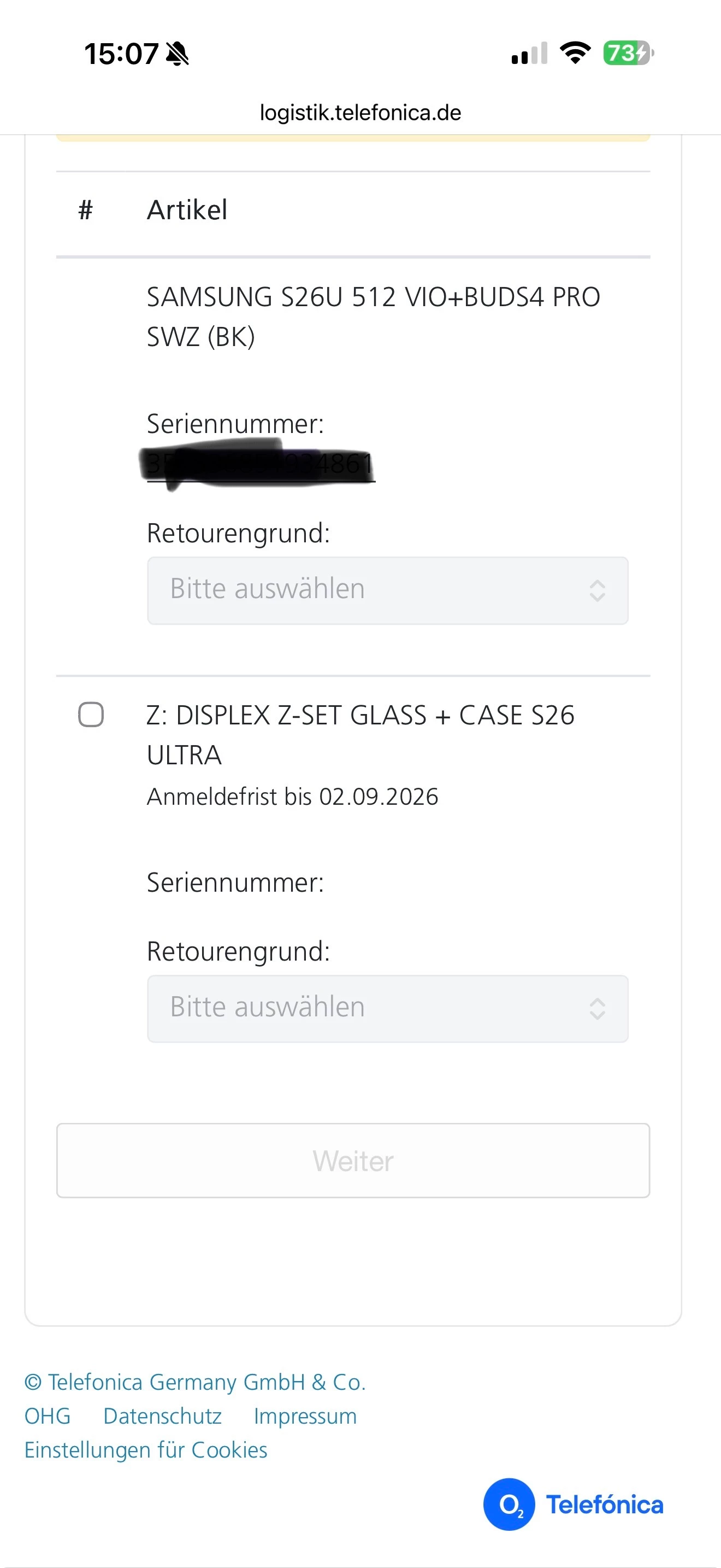 Über das retourenportal geht es nicht, alle Felder sind ausgegraut. Habe auch im O2 Shop angerufen, er kam auch nicht weiter.