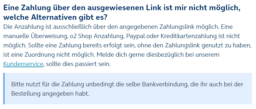 Ist nach einer Bestellung eine Anzahlung erforderlich, erfolgt diese über den in der Mail angegebenen Zahlungslink und ist auch nur über diesen Link möglich. AcceptEmail ist ein autorisierter Telefónica Partner. Mehr Informationen dazu findest du hier: Alternatives Zahlungsangebot - Infos zu AcceptEmail