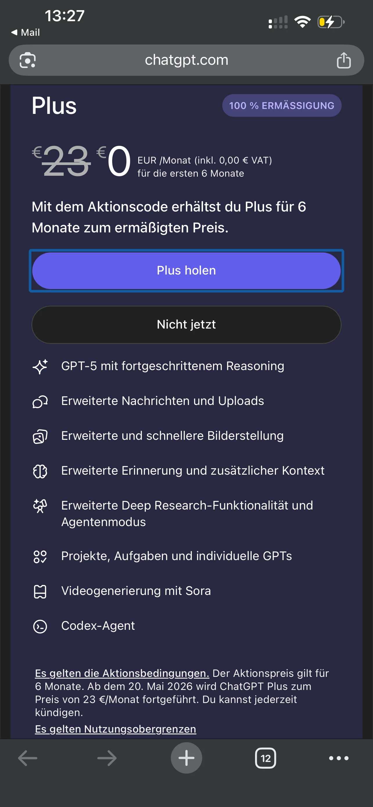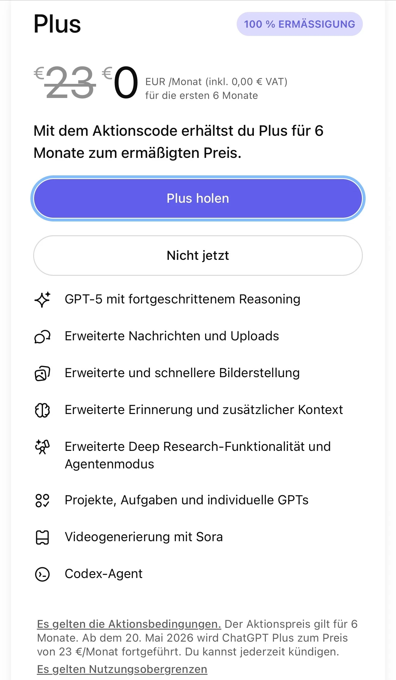 Es wird je Vertrag ein Code ausgegeben. Das Angebot ist nur einmal einlösbar und gilt nicht für Kunden, die bereits ChatGPT Plus oder einen Pro Account haben.