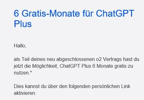 Hallo ich habe auch vor kurzem einen neuen Vertrag abgeschlossen aber diesbezüglich keine E-Mails von o2 erhalten weder eine Rechnung oder ähnliches, liegt das an der Mail die hinterlegt wurde oder an o2? Ich habe auch noch kein ChatGPT Code erhalten. Die Geräte sind aber schon angekommen und eingerichtet.