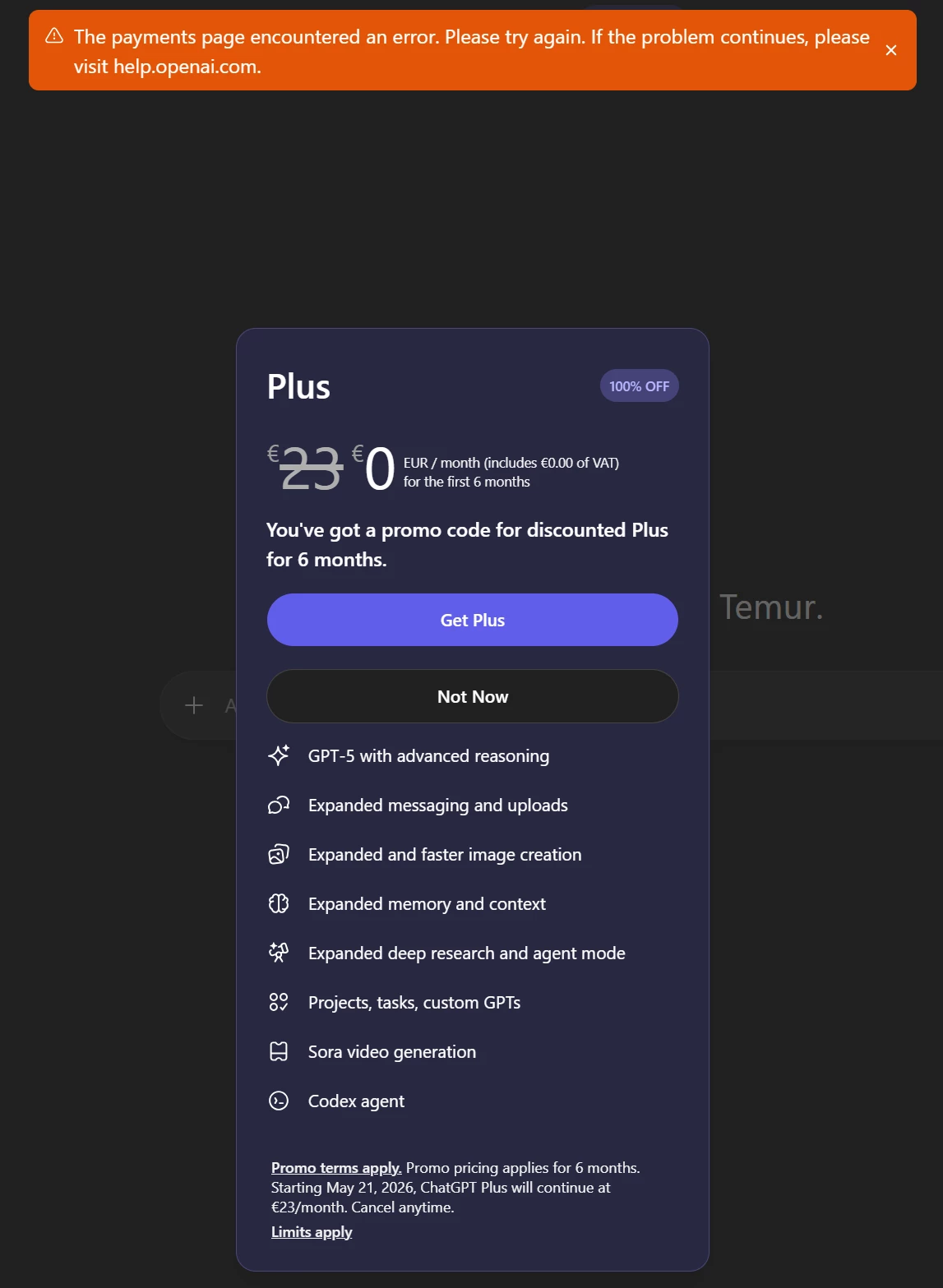 “After reviewing the screenshot you shared, it appears that the issue is related to the start date of the promotion. At the bottom of the offer window, it states that the promotional pricing will begin on May 21, 2026. Because of this future start date, the system is currently preventing activation, which is why you're seeing the payment error despite the promo showing as valid.