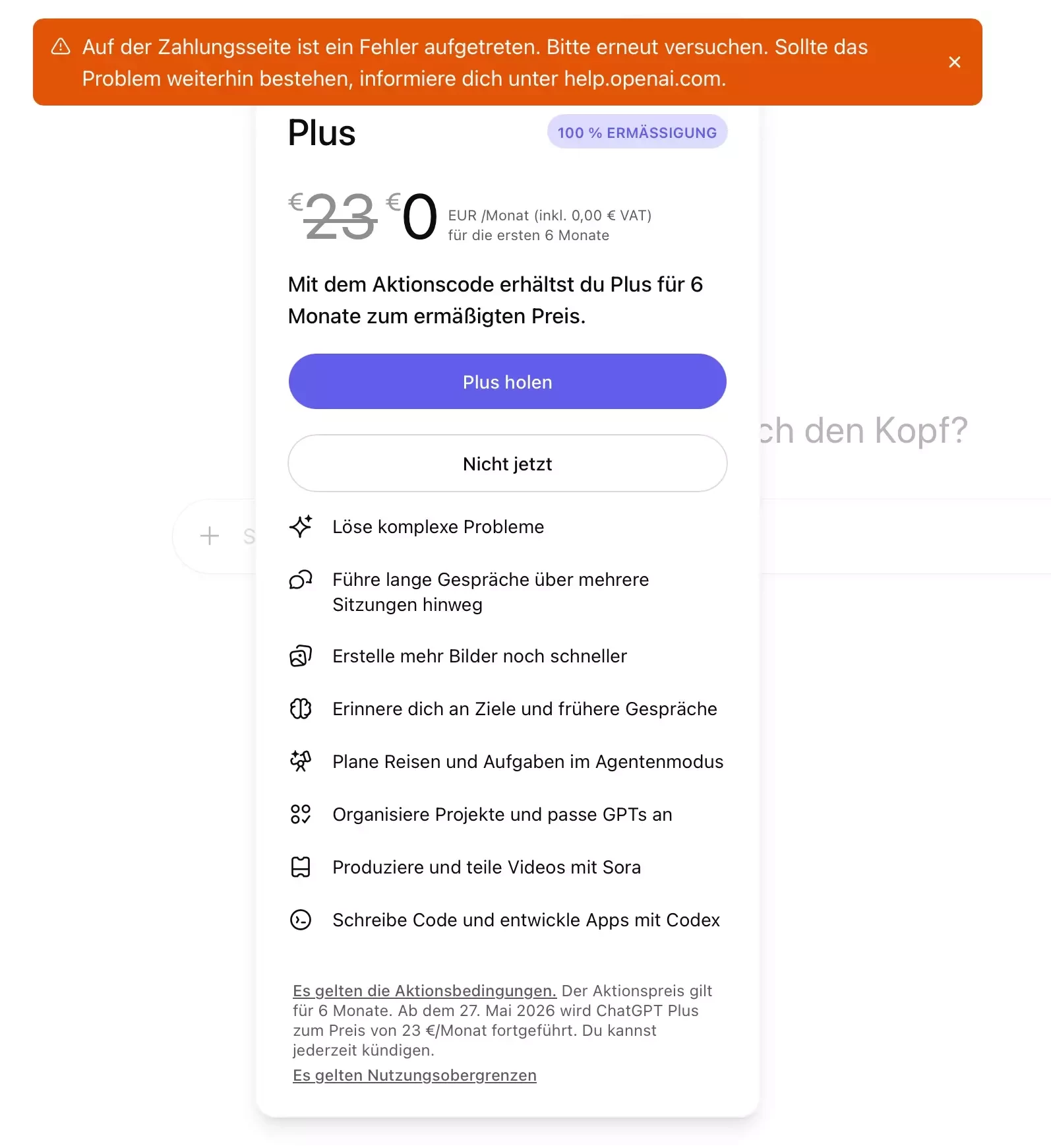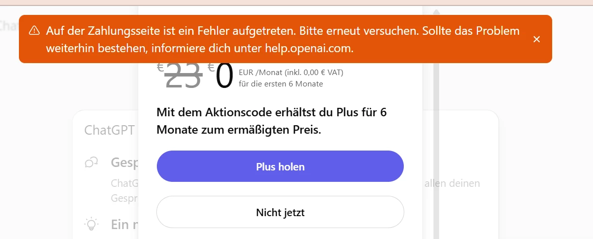 “Auf der Zahlungsseite ist ein Fehler aufgetreten. Bitte erneut versuchen. Sollte das Problem weiterhin bestehen, informiere dich unter help.openai.com.”