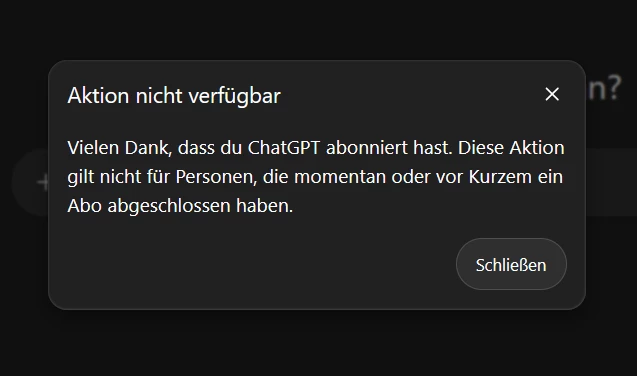 “Aktion nicht Verfügbar. Vielen Dank, dass du ChatGPT abonniert hast. Diese Aktion gilt nicht für Personen, die momentan oder vor Kurzem ein Abo abgeschlossen haben”