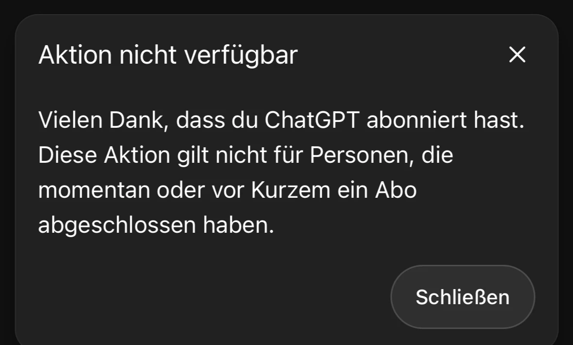 ja habe auch im Broswer probiert im Inkognito Modus. Ich habe auf einer Dealplattform gelesen, dass viele andere auch das Problem hatten. Wahrscheinlich war das Ablaufdatum der Links seitens o2 bzw. ChatGPT falsch hinterlegt. Diese hätten ja bis zum 15.01.2026 gelten sollen, aber waren am 15.01.26 abgelaufen.