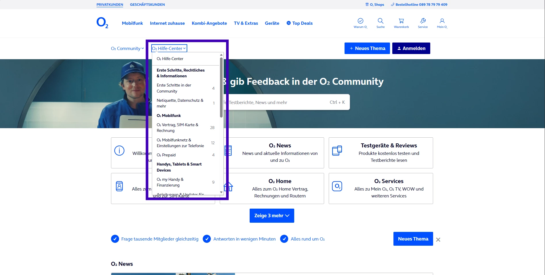 Startseite in der O₂ Community mit geöffnetem Hilfe-Center Dropdown
