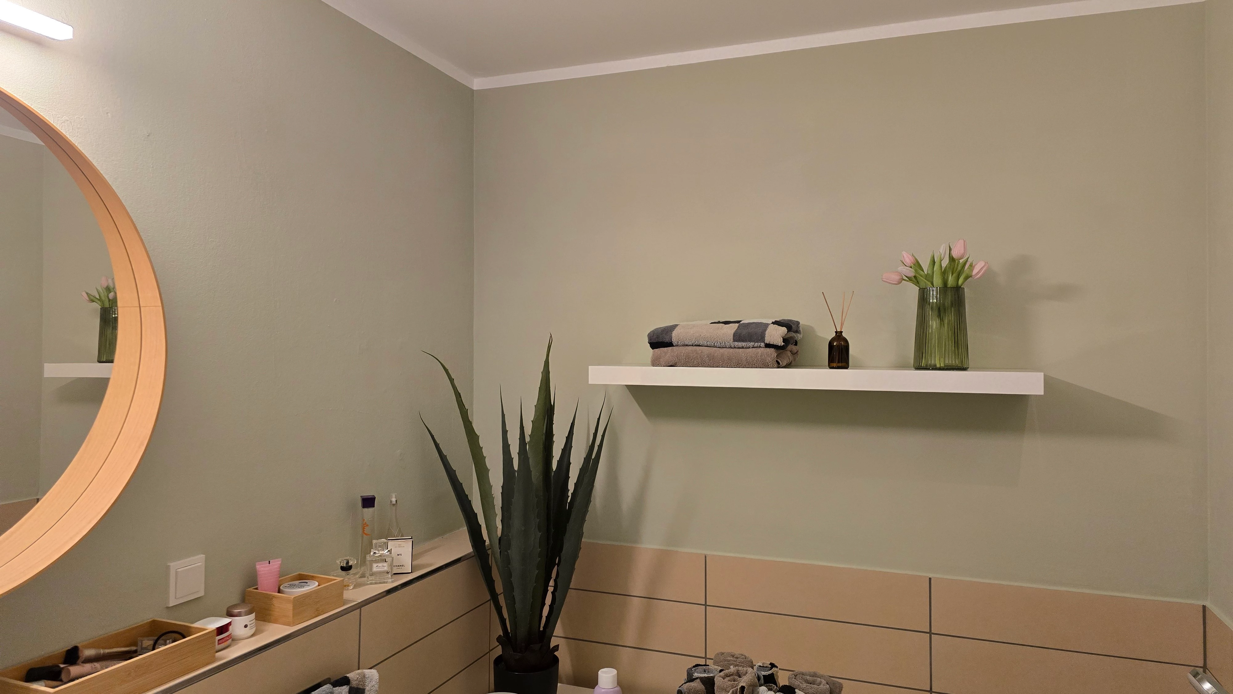 Statt Osterdeko gab es ein Badezimmer-Makeover für meine liebe Mum. Die Wand erhielt ein schönes Salbeigrün und dazu gab es einen neuen Spiegel, eine neue Lampe und diverse andere Behältnisse in Holzoptik. Ach und das Lack Regal. Hat zwar nichts direkt mit Ostern zu tun, aber der Frühling und die Freude darüber ist eingezogen 😉