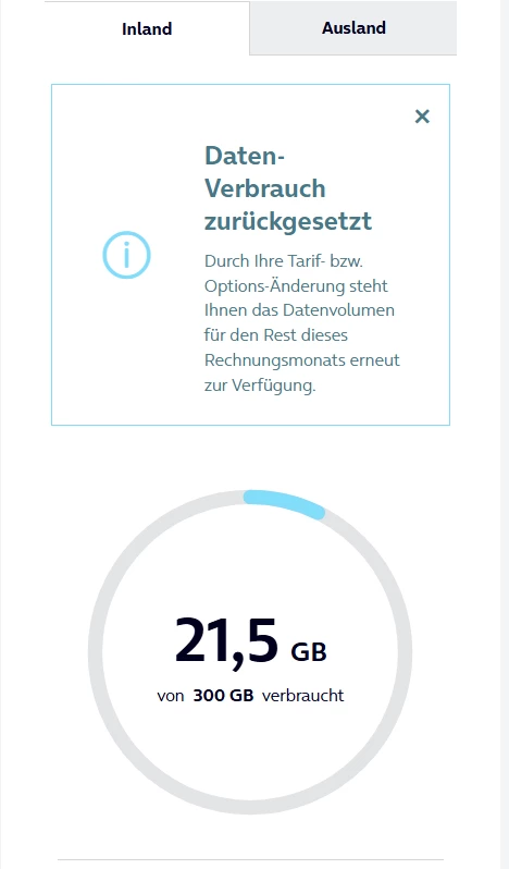 Wechsel auf Mobile XL (2024): FUP lief logischerweise weiter mit angepasster Anzeige auf 64,7 GB. Zähler im Onlineportal : Meldung Zähler wird ZURÜCKGESETZT. Datenvolumen korrekt angezeigt im Portal sowie in der App mit 300 GB.