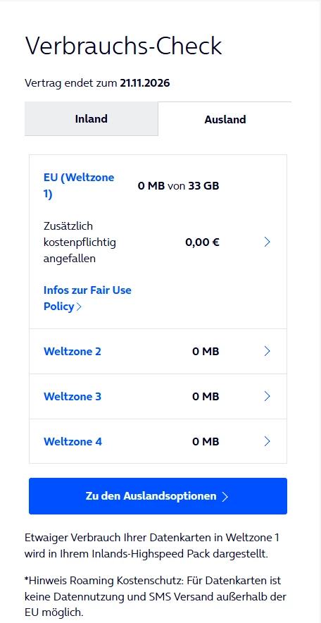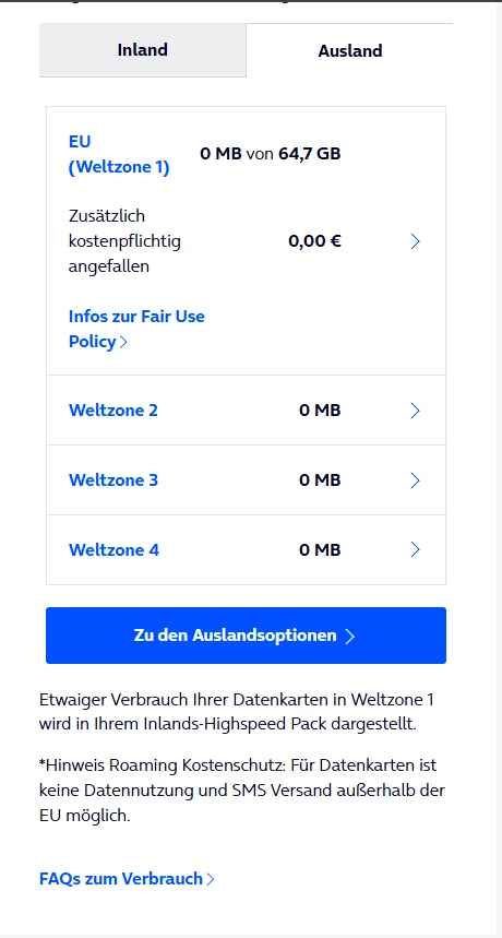 Zähler 1 : der jeweilige Kundentarif Inland mit entsprechenden Datenvolumen (bei Konvergenzvorteil oder “Sommeraktion” wird das Datenvolumen zum Kundentarif hinzuaddiert. Wir wissen beide das unbegrenzt nicht unbegrenzt ist).