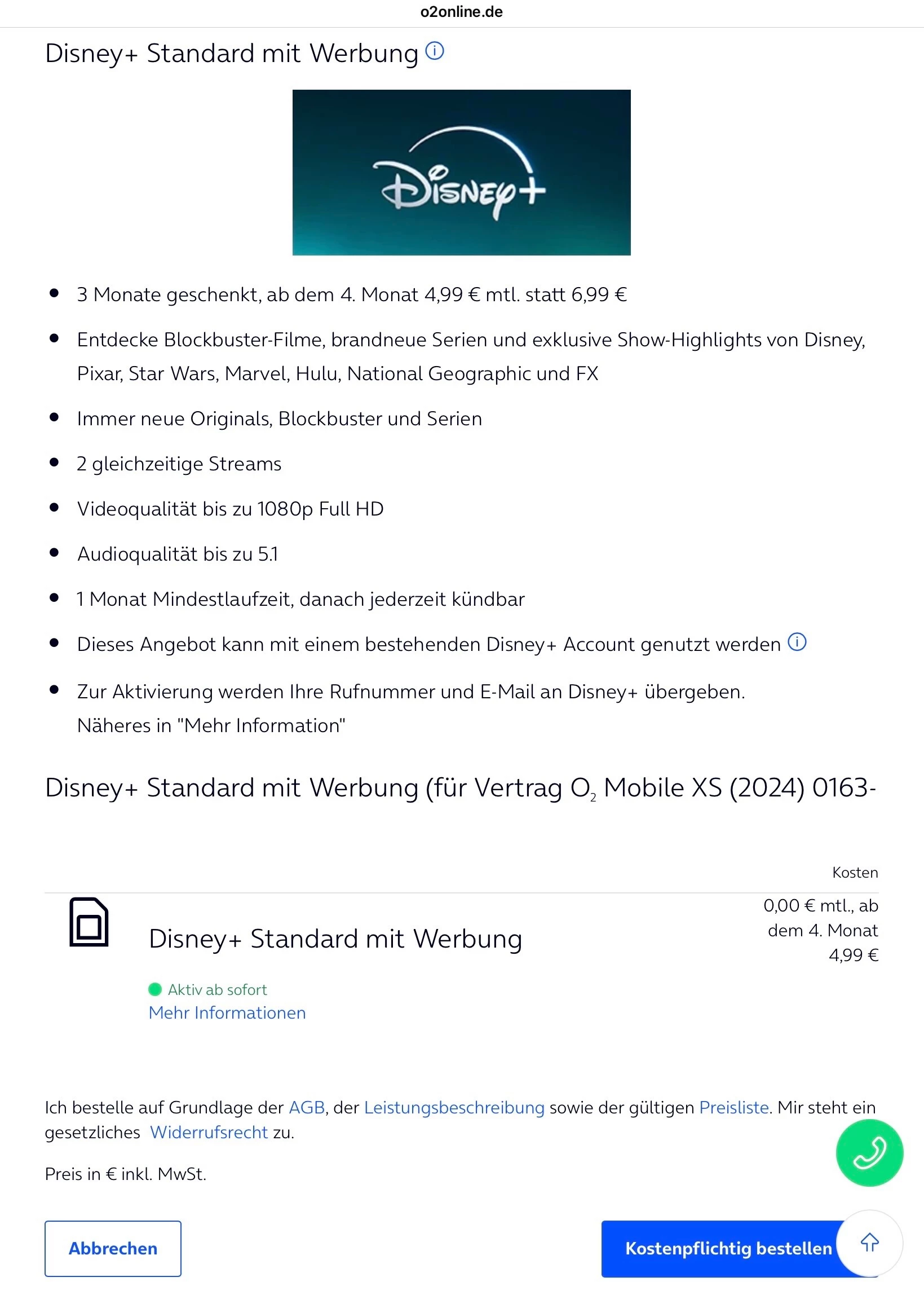 • Über den zugsendeten Link gelangt ihr zur O₂ Webseite und könnt das Disney+ “ Standard mit Werbung” Pack bestellen.