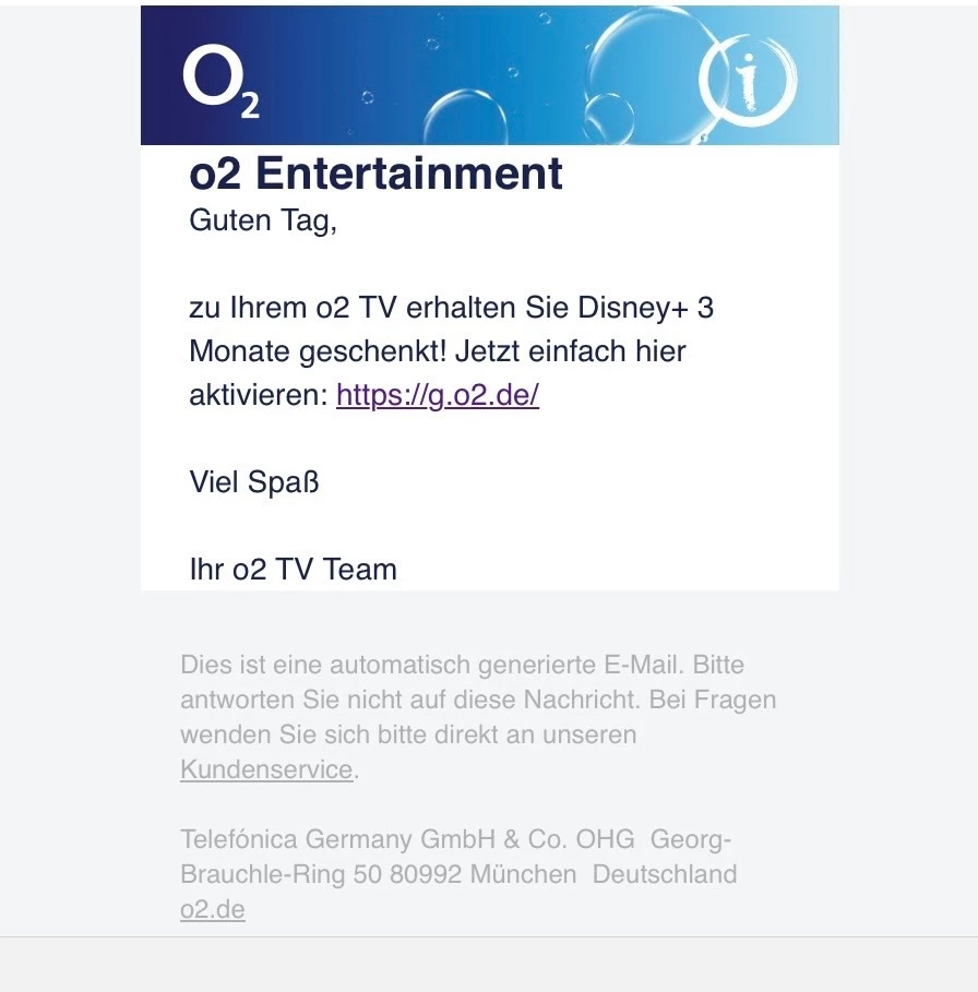 Das perfekte Entertainment-Duo im neuen Jahr: Ab sofort erhaltet ihr mit der Buchung eines O₂ TV M, L oder XL Pakets auf Wunsch 3 Monate Disney+ “ Standard mit Werbung” kostenlos dazu. Ab dem 4 Monat zahlt ihr dann nur 4,99 EUR statt 6,99 EUR monatlich. Wenn ihr euch für das O₂ TV M oder L Paket entscheidet, erhaltet ihr zusätzlich einen kostenlosen Monat O₂ TV geschenkt und zahlt erst ab dem zweiten Monat 6,99 (Paket M) bzw. 9,99 EUR (Paket L) monatlich, ohne Mindestlaufzeit. Beim O₂ TV XL bekommt ihr zusätzlich ein Allround-Paket inklusive Netflix “Standard Abo mit Werbung” für 12,99 EUR monatlich, bei 12 Monate Mindestlaufzeit.