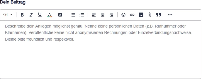 Hinweis im Textfeld, keine persönlichen Daten zu veröffentlichen.