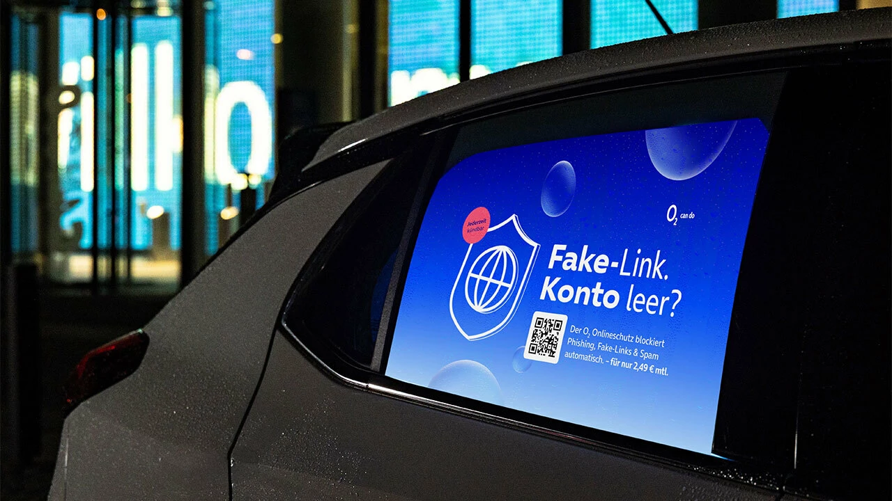 Werbetafel auf einem Carsharing-Auto mit Werbeanzeige zum digitalen O₂ Onlineschutz