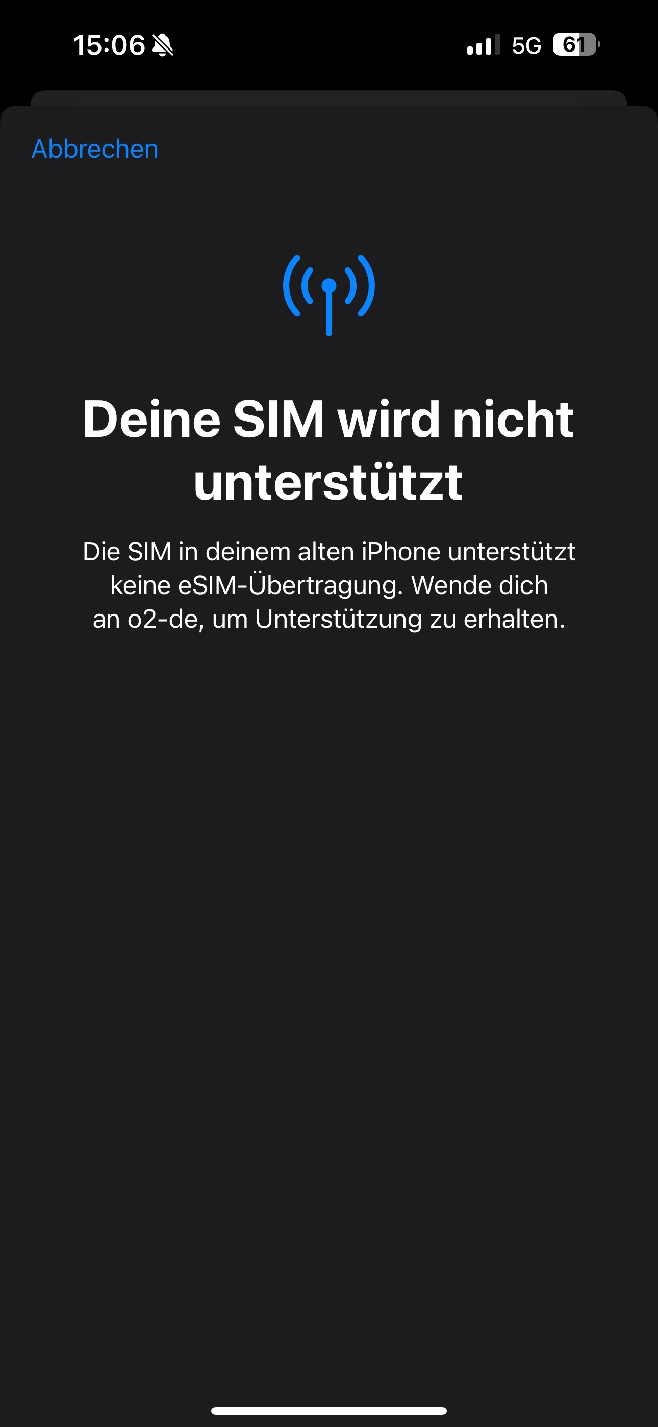 Habe also die Schnellübertragung mit der ersten eSIM versucht, dann gleich die Ersatzkarte bestellt und es damit erneut versucht.