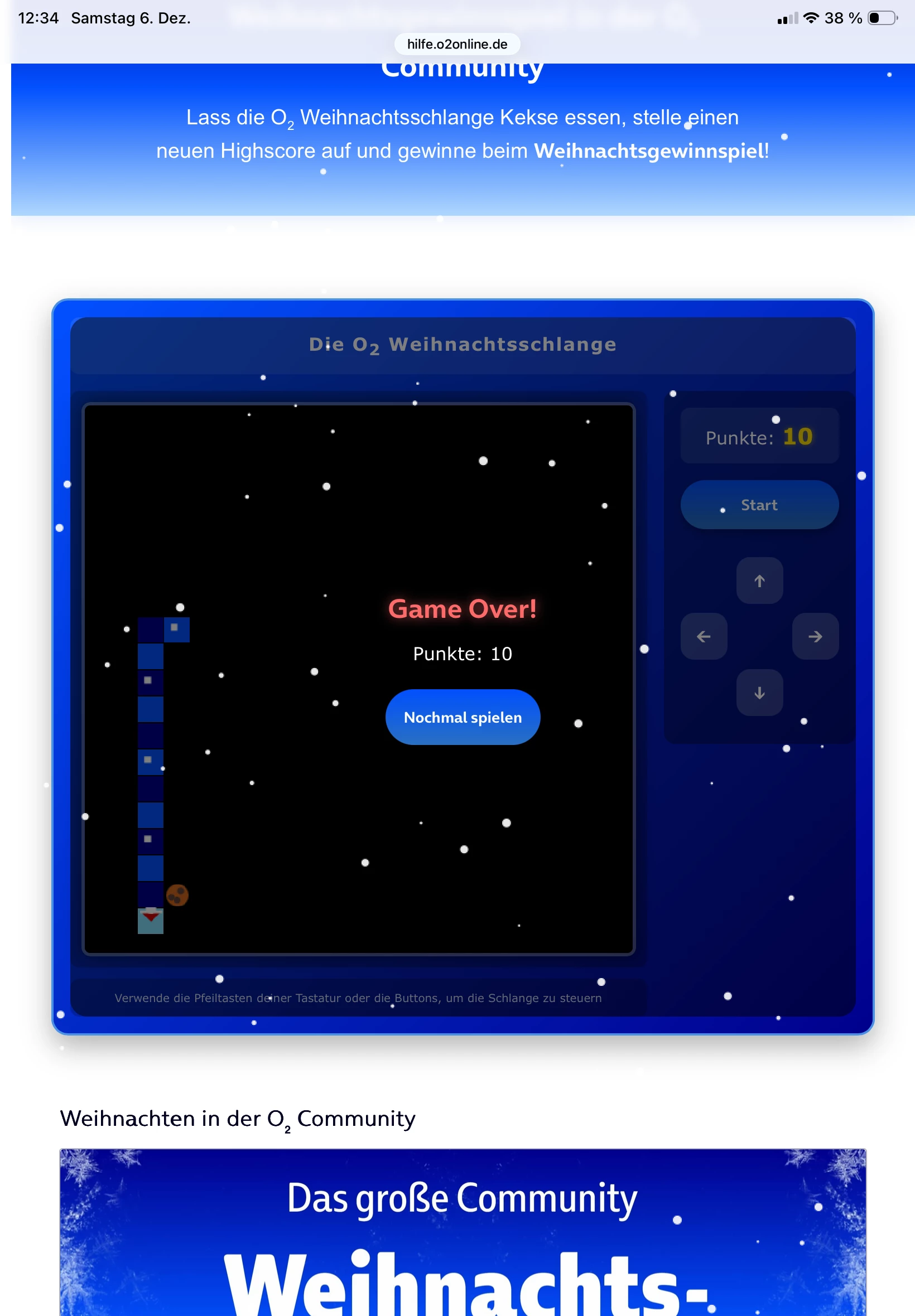Die O₂ Weihnachtsschlange ist hungrig und zwar auf Kekse. Spielt das Spiel in unserer digitalen Weihnachtsbäckerei und erreicht möglichst viele Punkte. Anschließend macht ihr einen Screenshot von eurem persönlichen Highscore. Postet den Screenshot bis einschließlich dem 12. Dezember 2025 in die Kommentare. Damit seid ihr automatisch im zweiten Teil unseres Adventsgewinnspiels dabei.