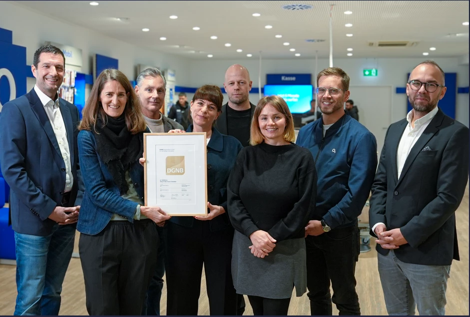 Die DGNB ist Europas größtes Netzwerk für nachhaltiges Bauen. Für die Vergabe des Zertifikats nutzt die DGNB eine ganzheitliche Bewertungsmethodik, in der mithilfe von 15 Kriterien das Shop-Konzept bewertet wurde. Angefangen mit der Planung, dem Rollout und der Nutzung des Shops bis zum potenziellen Rückbau wird der gesamte Lebenszyklus eines Shops mitberücksichtigt. Wir freuen uns über einen Gesamterfüllungsgrad von 70 Prozent bei der Bewertung, was zur Gold-Auszeichnung führte.