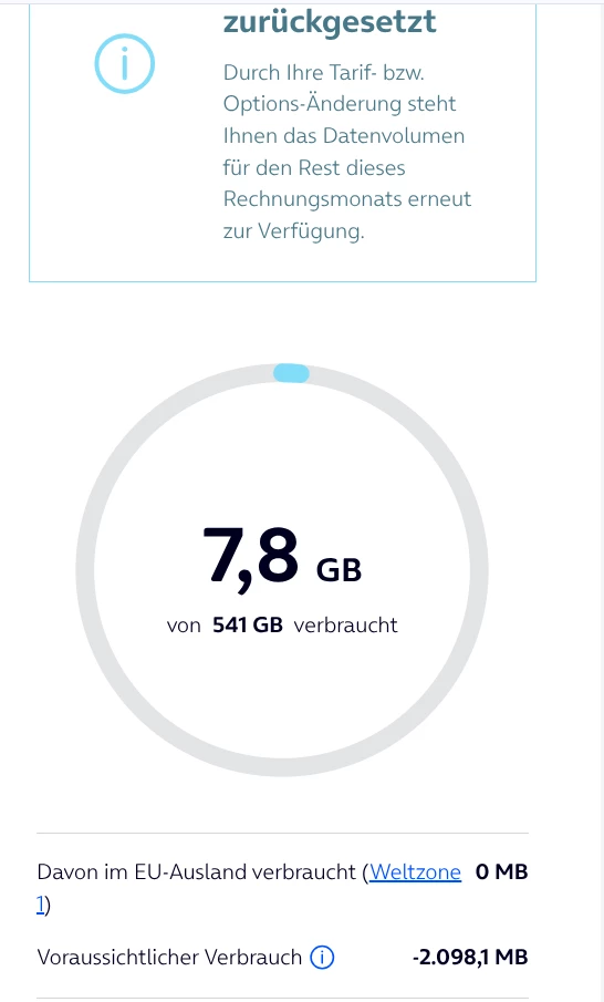 @Bumer durch die VVL ist das Pack ja rausgeflogen und heute früh Stand im Verbrauchskreis 41GB und nach Buchung der Option wieder 541GB wie vorher auch.
