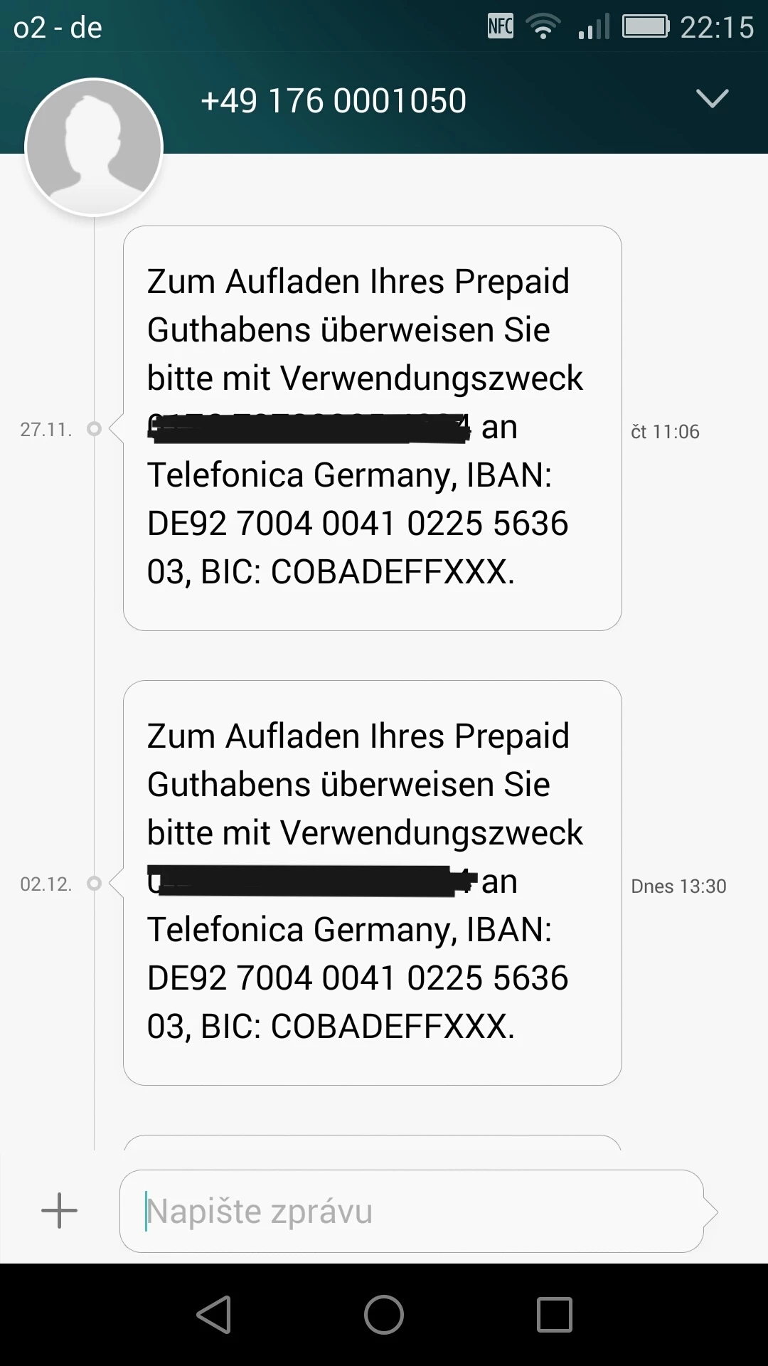 also bei mir hat die Aufladung von 0,01 EUR nicht geklappt. Ich habe eine SMS an 56656 geschickt und Anweisungen für eine Banküberweisung erhalten (26. November). Die IBAN war jedoch anders: DE92 7004 0041 0225 5636 03 (nicht DE87 7002 0270 0037 0806 08). Ich habe die Überweisung sofort getätigt und bis heute keine SMS über die Gutschrift oder die Verlängerung meiner SIM-Karte erhalten. Stattdessen bekam ich am 29. November eine Nachricht, dass meine SIM-Karte gesperrt wurde. Wo liegt also der Fehler?