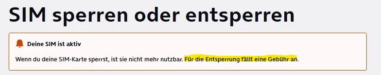 Wenn du deine SIM-Karte sperrst, ist sie nicht mehr nutzbar. Für die Entsperrung fällt eine Gebühr an."