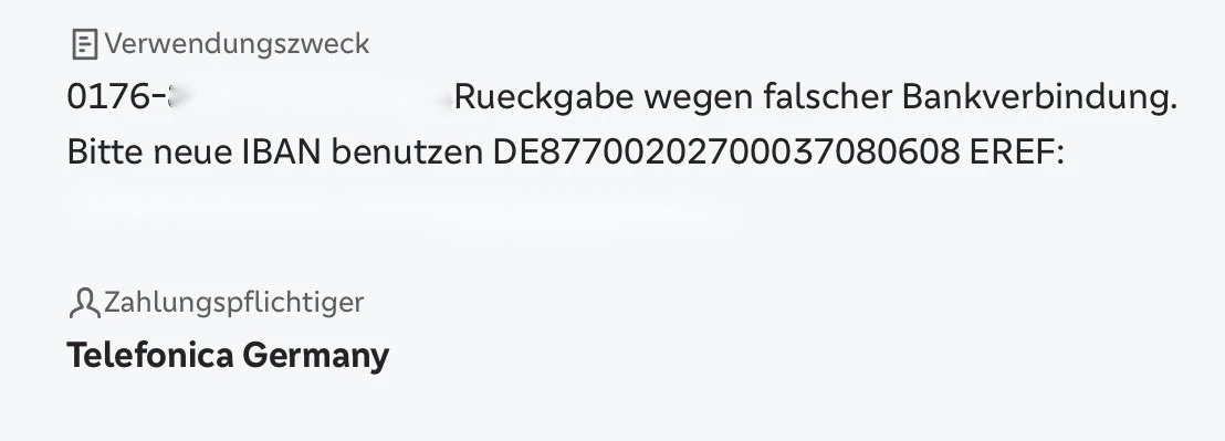 Ich habe die Überweisung auf dieses Konto gemacht (Telefonica Germany DE73 7002 0270 0005 7169 77). Ich habe das seit über einem Jahr ohne Probleme so gemacht, aber ich bin mir nicht sicher, ob es in letzter Zeit irgendwelche Änderungen gegeben hat.
