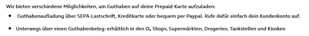 wenn du diesen Beitrag meinst https://www.o2online.de/mobilfunk/prepaid/prepaid-basistarif/, den habe ich ja gelesen, es steht eben nichts über Überweisen (oder per Dauerauftrag) , sondern Aufladen nur Lastschrift (plus Paypal und KK) was etwas anderes ist. Übersehe ich was?