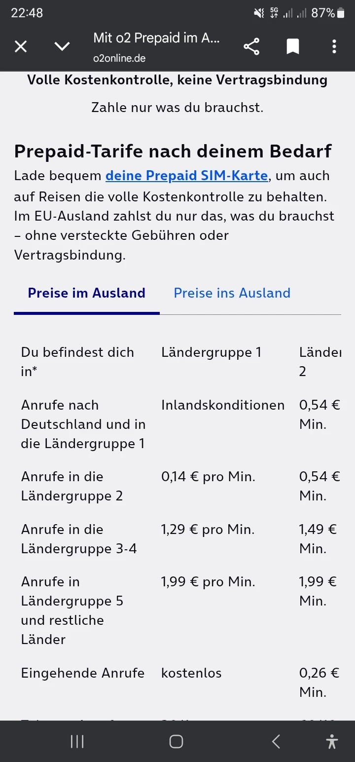 ich brauche bitte Aufklärung beim Telefonieren mit der O2 Prepaid S Karte im Ausland.