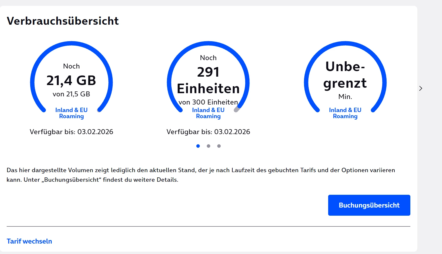 1,4 von 1,5GB frei noch, 291 von 300 Minuten… Läuft bis 3.02. Bisher war es immer so, dass er von Montag zu Dienstag Nacht abgebucht hat und ich glaube Sonntag Abend immer die Info-SMS kam, das würde ich gerne so beibehalten,
